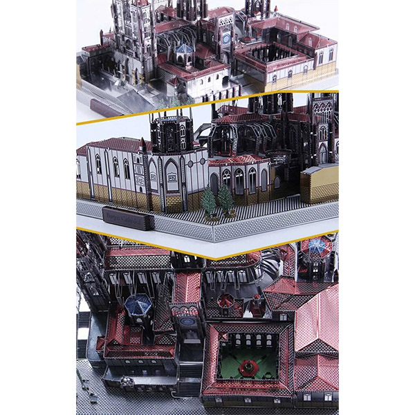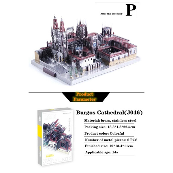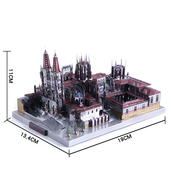 پازل فلزی سه بعدی Burgos Cathedral.شامل 4 ورق فلزی هست که اجزای پازل بر روی آنها حکاکی شده و پس از جدا کردن این قطعات میتوان به راحتی آنها را به وسیله ی پین ها و شیارهای موجود در یکدیگر جایگذاری کرد و بدون چسباندن، مدل مورد نظر را ساخت.
