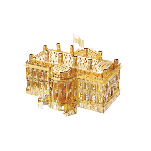 پازل فلزی سه بعدی مدل White House.شامل دو ورق فلزی طلایی هست که اجزای پازل بر روی آنها حکاکی شده و پس از جدا کردن این قطعات میتوان به راحتی آنها را به وسیله ی پین ها و شیارهای موجود در یکدیگر جایگذاری کرد و بدون چسباندن، مدل مورد نظر را ساخت.